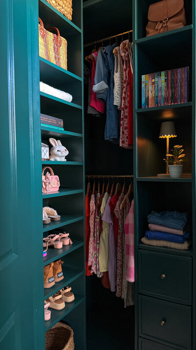 When our Founder set out to make over her 8-year old daughter's room, she told her daughter to choose any colors she wanted. Boy, did she deliver! This beautiful custom closet was painted Sherwin Williams' "Rainstorm," and it just might be our favorite closet we've done to date.